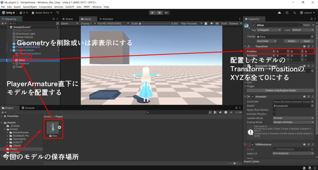 ①HierarchyウィンドウにてPlayerArmatureの子オブジェクトのGeometryを削除或いは非表示にする。